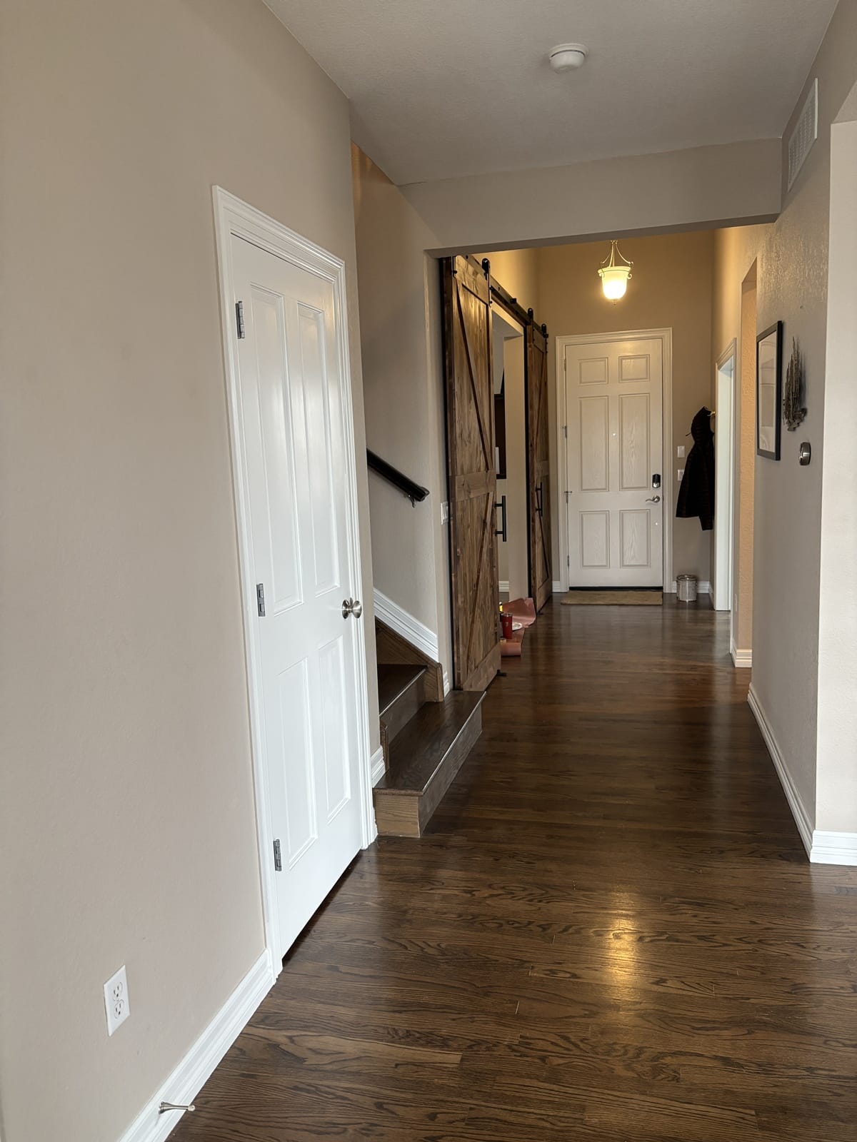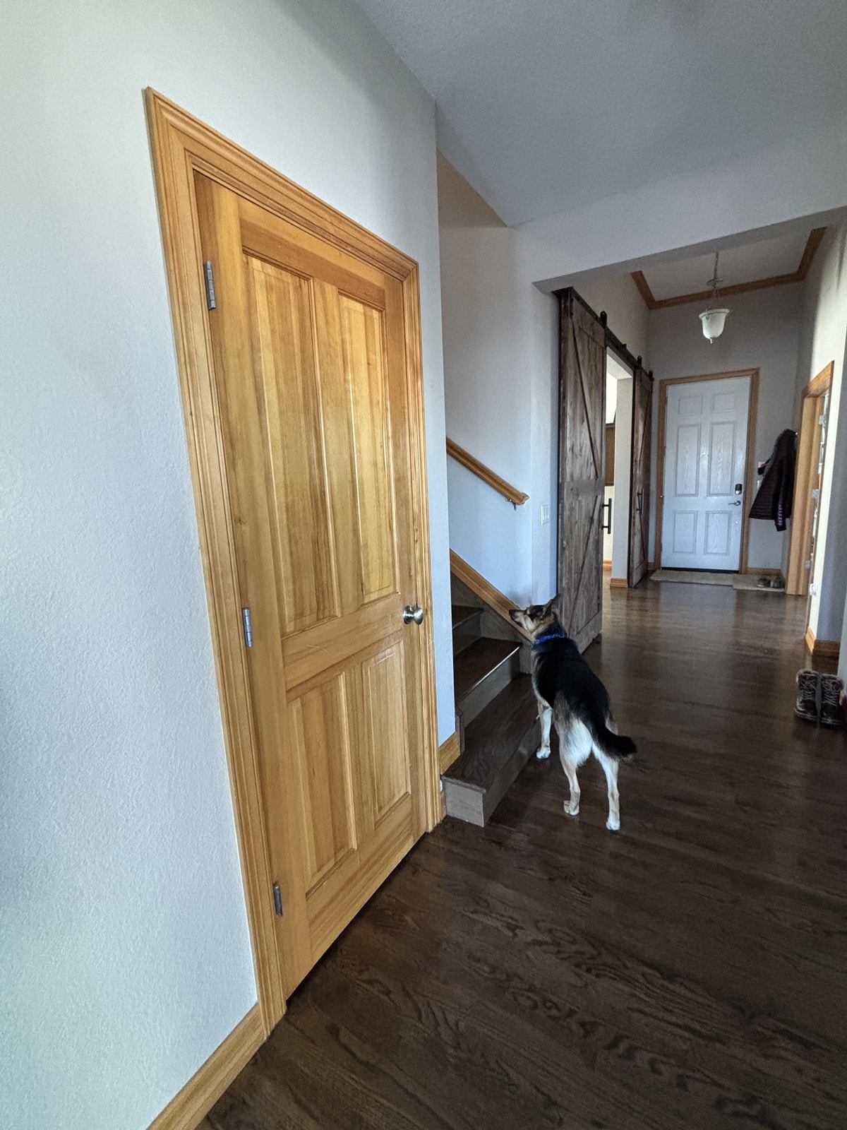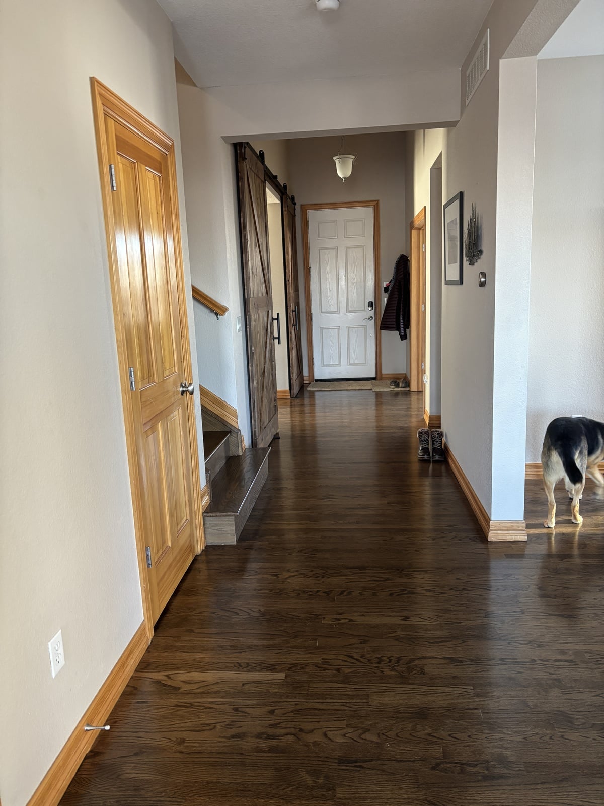 The staircase was transformed with a rich Minwax Dark Walnut stain, followed by three coats of dull rubbed lacquer for a durable, elegant finish. The newly painted trim, doors, and baseboards in Pure White created a crisp contrast and completely modernized the main level.