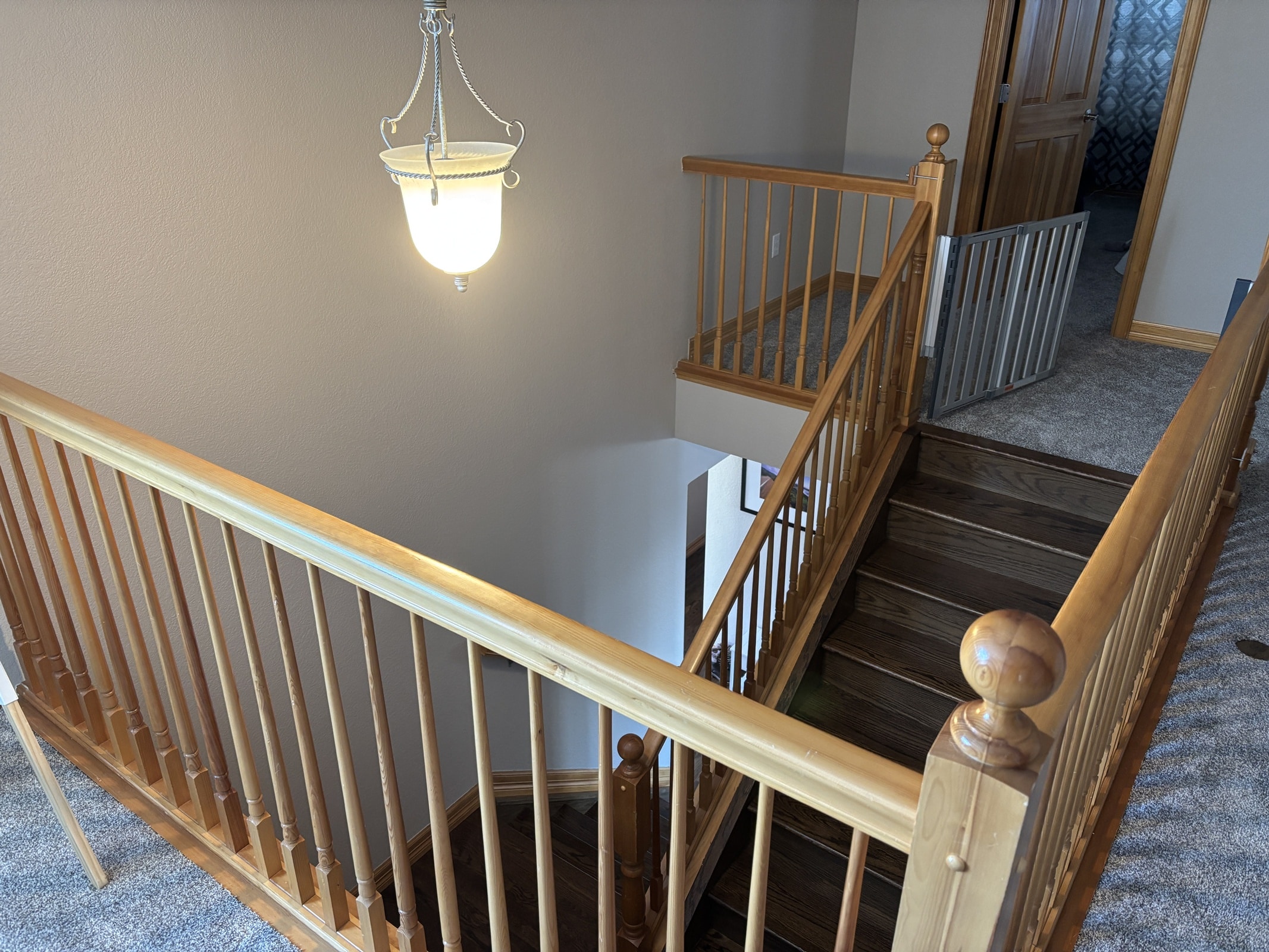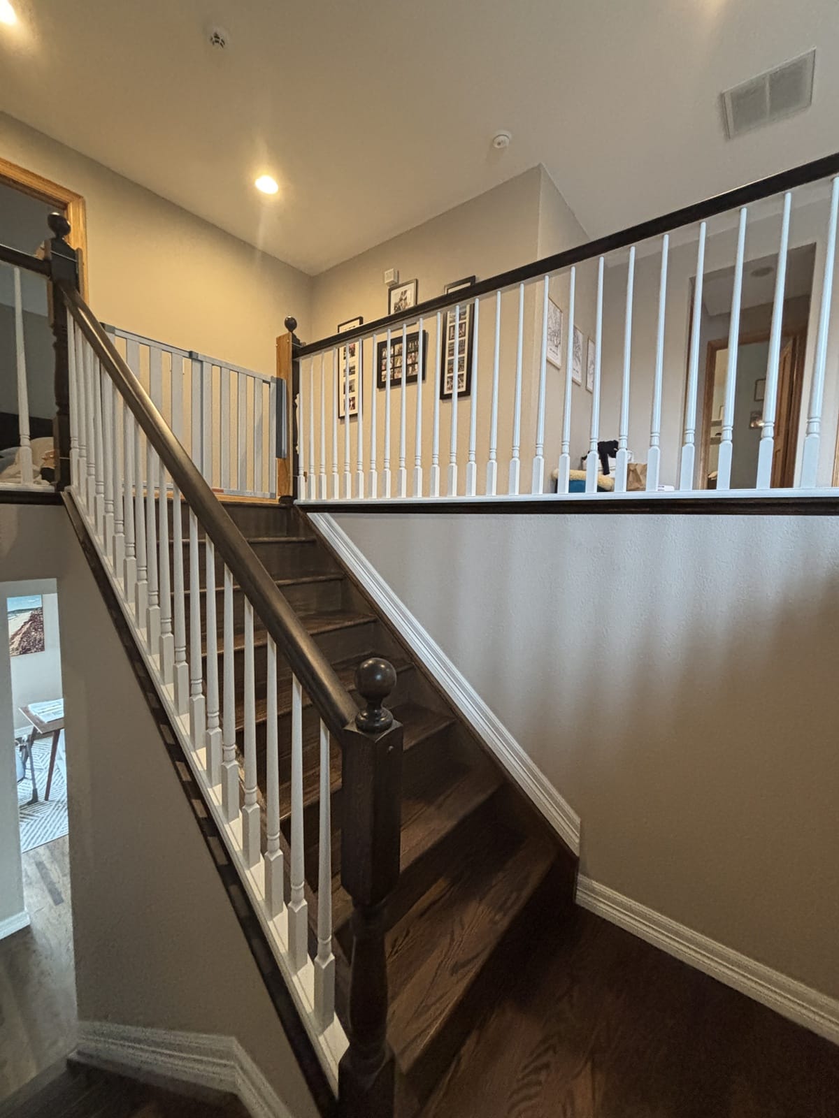 - Staining newel posts and handrails with a darker finish to achieve a richer, more modern aesthetic