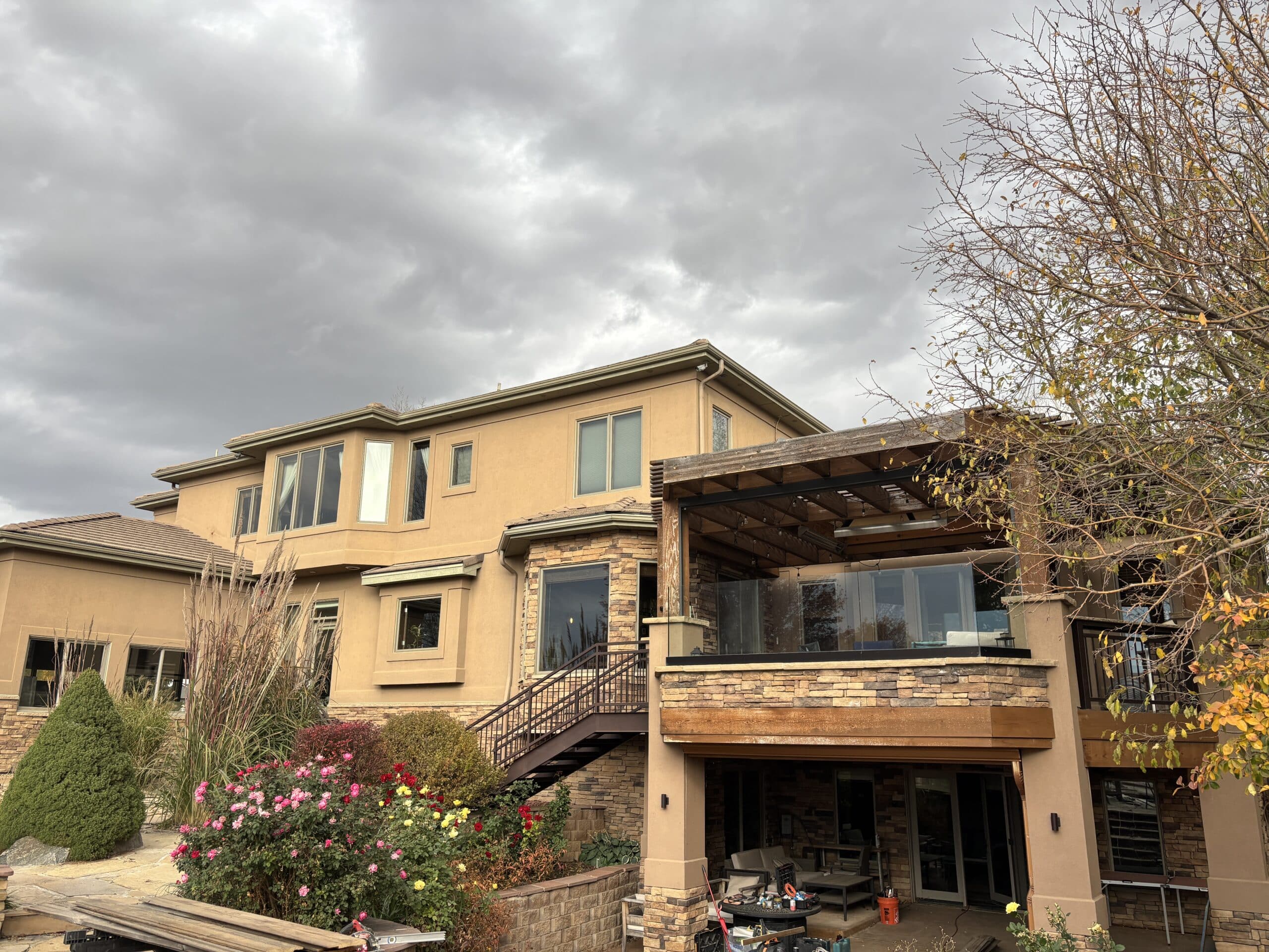 The main improvement came from repainting the stucco trim using Sherwin-Williams Duration in Urbane Bronze. This darker accent color helped break up the flat look of the home and highlight architectural details that were not visible before. The pergola was also refinished using Sherwin-Williams Woodscapes Solid in the same color to tie everything together.