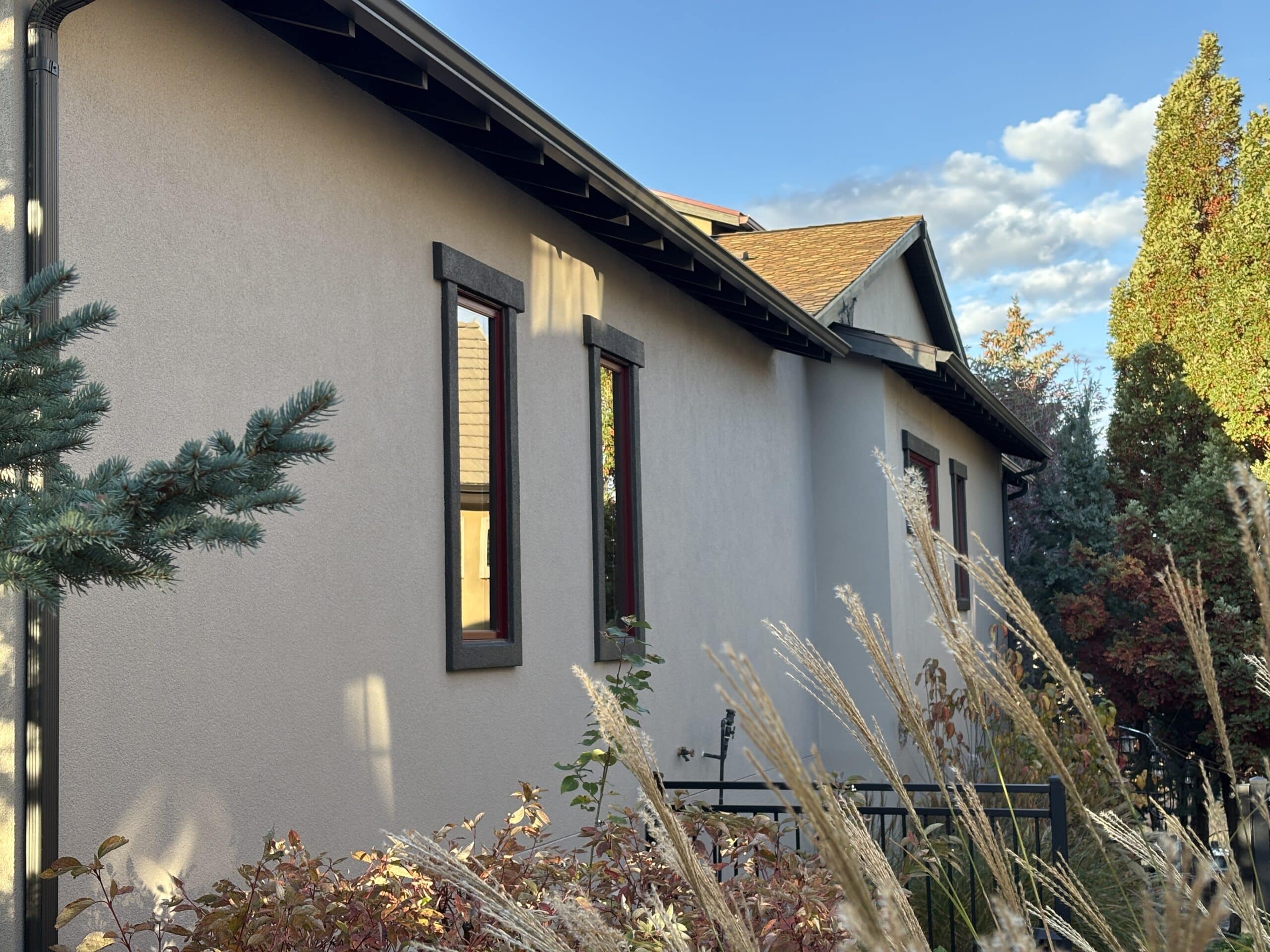 The completed stucco painting project gave the home a fresh, updated exterior while also addressing long-standing surface issues. The lighter gray color softened the look of the home and worked well with the previously painted trim. Refinished light fixtures tied everything together and avoided the cost of replacing them. Kim was thrilled with the outcome and appreciated that the project solved a functional problem while improving curb appeal.